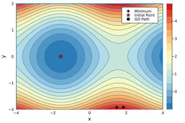 scatter!(p1, xs1[1:1], ys1[1:1], mc=:black, label="GD Path", xlims=(-4,4), ylims=(-2,2))
